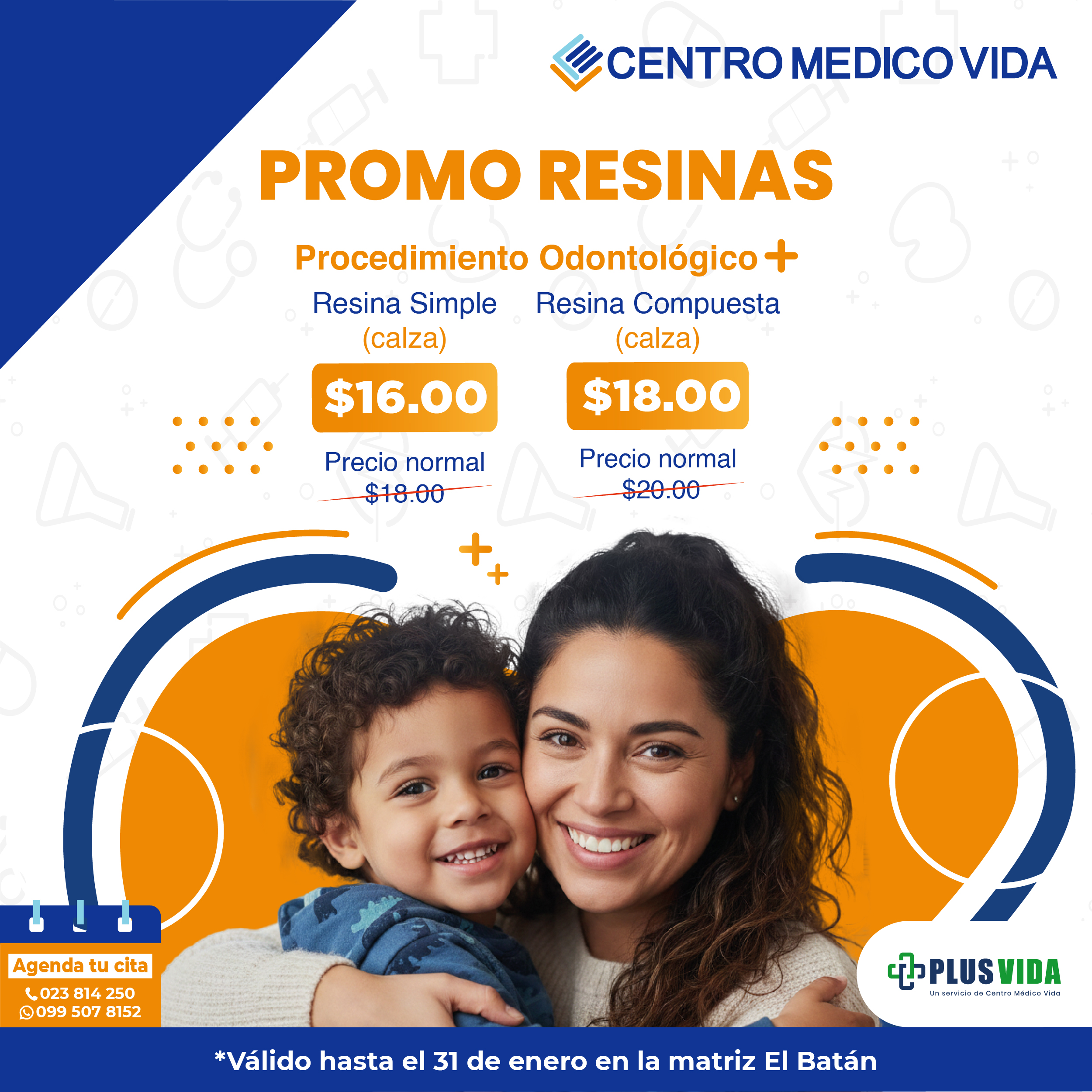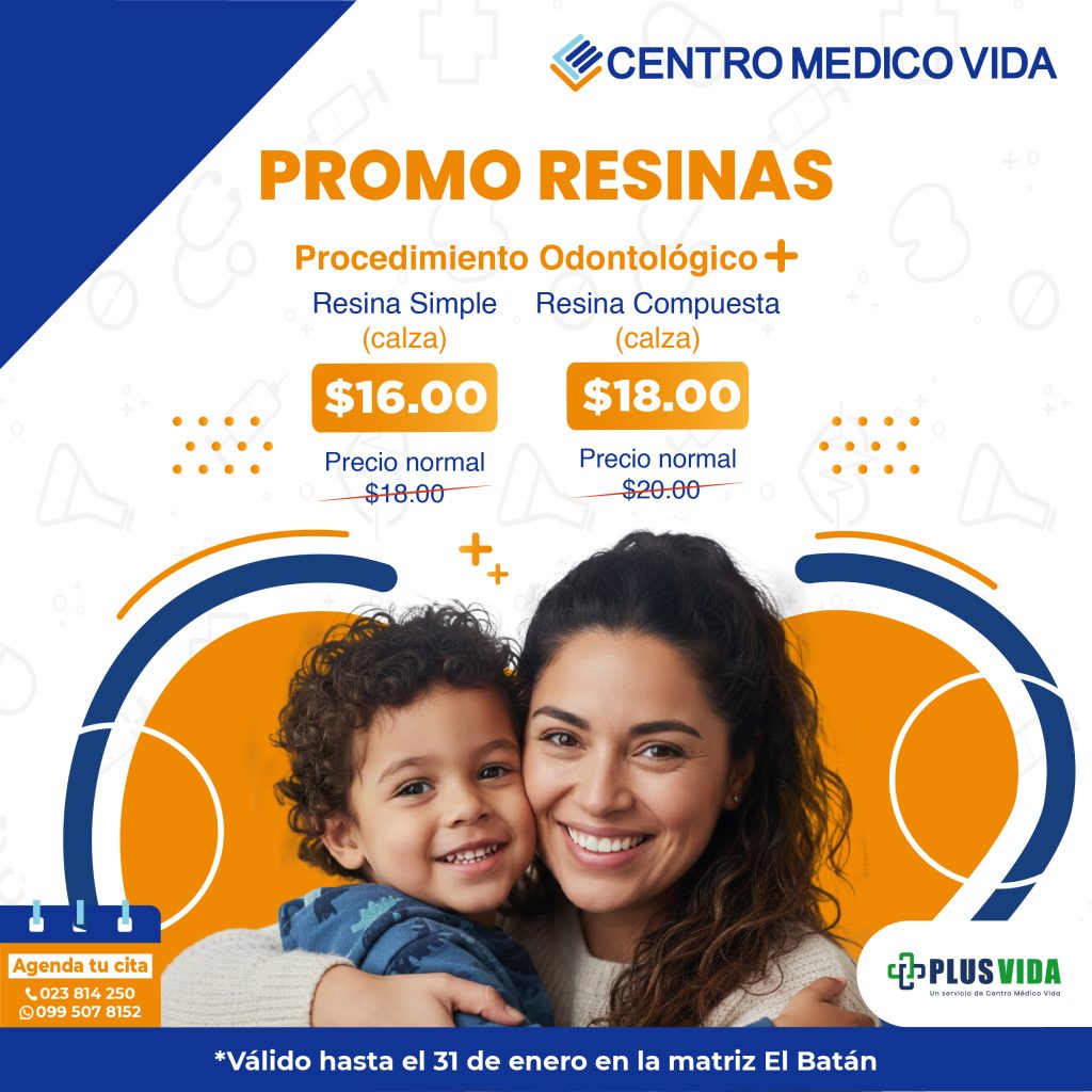 Incluye resina compuesta o resina simple, ambas con consulta odontológica, para asegurar un diagnóstico adecuado y tratamiento de calidad.