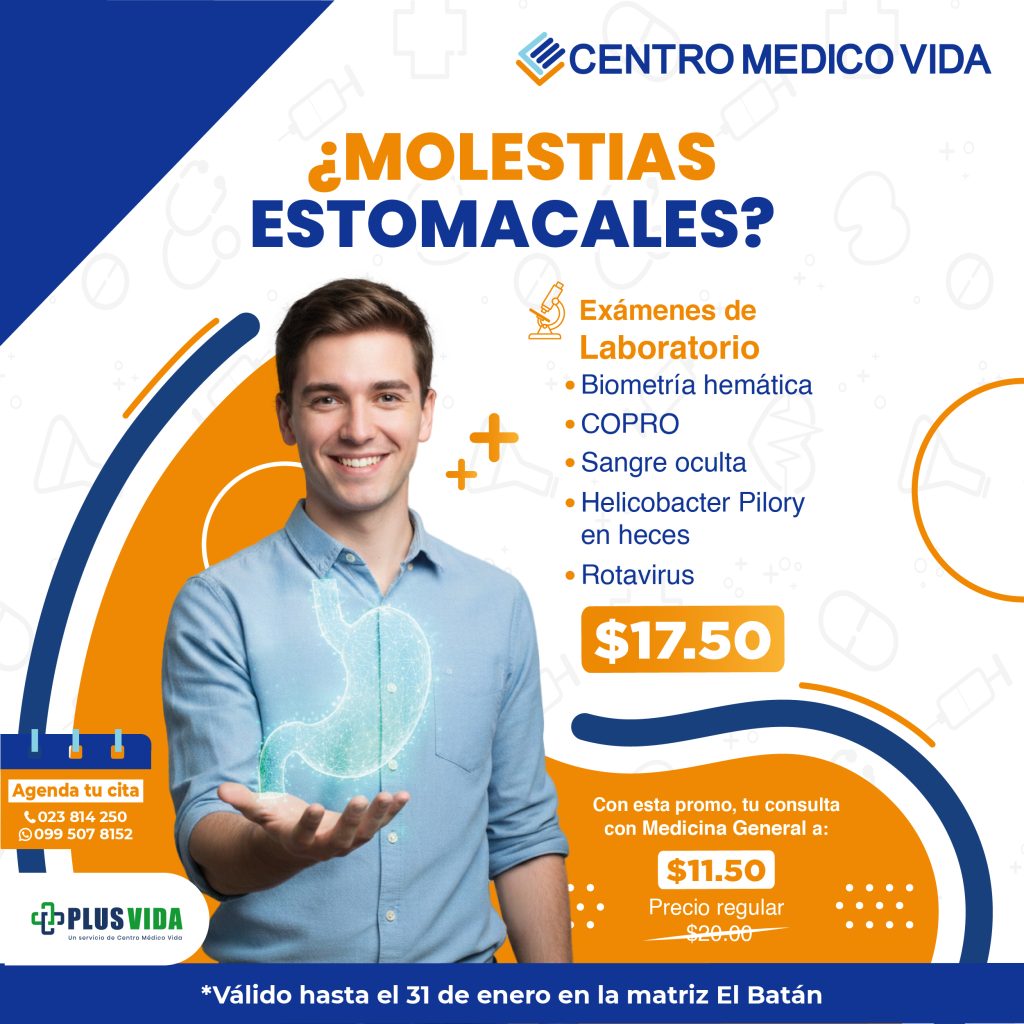 Esta promoción incluye exámenes de laboratorio especializados para evaluar tu sistema digestivo y una consulta con Medicina General a precio especial, donde el médico interpretará los resultados y te indicará el tratamiento adecuado.