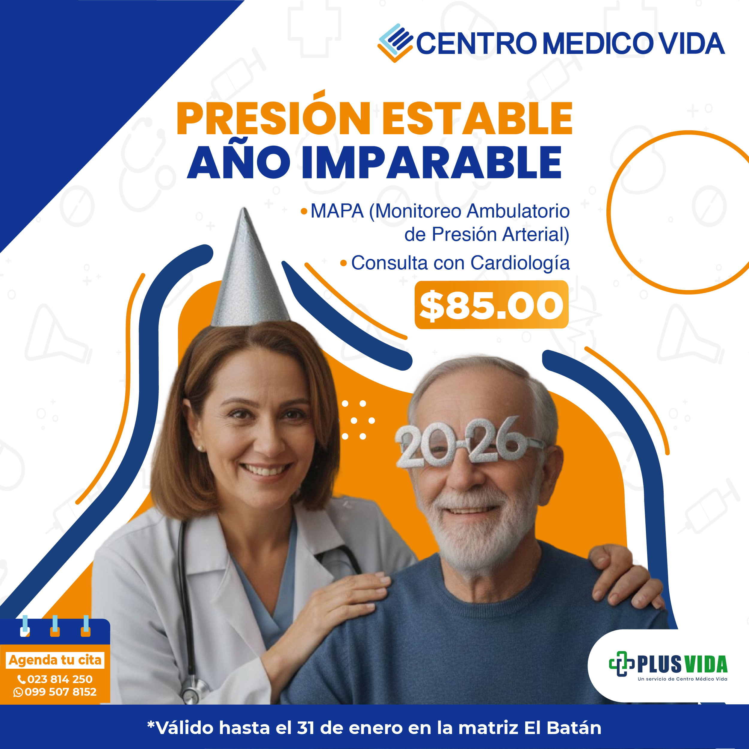 Este paquete incluye un MAPA, que registra tu presión arterial durante 24 horas, y una consulta con cardiología, donde el especialista evaluará los resultados y definirá el mejor plan para tu salud cardiovascular.